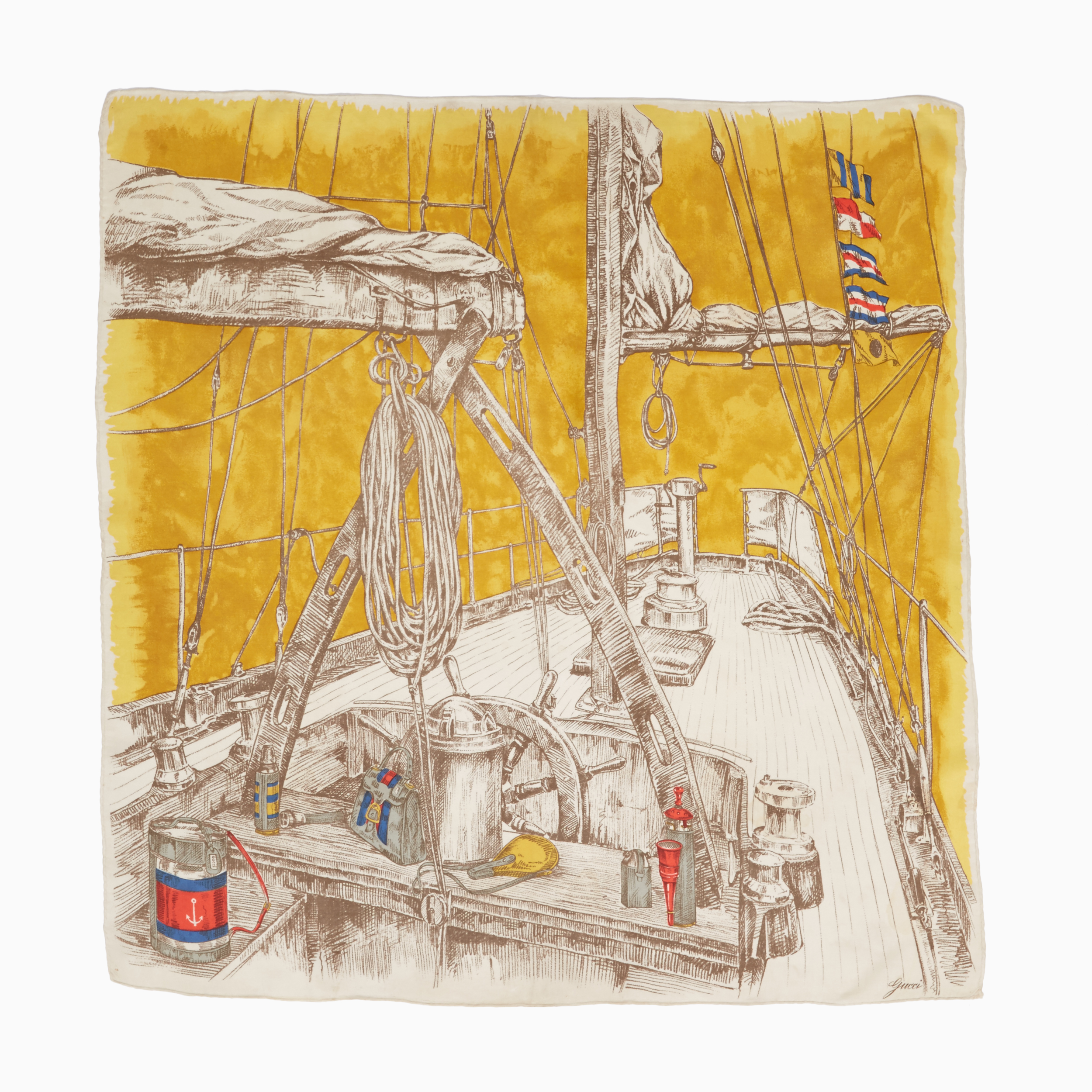 古驰对航海主题的热爱始于1950年代末的Tolda di Nave丝巾。进入1960年代,此主题在Accornero的创意演绎下大放异彩,成为古驰丝织品系列中不可或缺的关键元素。1970年代中期推出的Marina Chain图案最初运用于珠宝和配饰之上,并逐渐扩展至丝巾与成衣领域。其精致的交织链饰图案诠释了航海美学的优雅深邃。