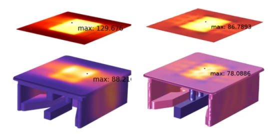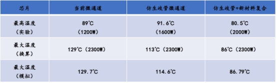 通过全尺寸仿真,在水冷工况、入口水温 40℃、流量仅为 2 L/min 条件下,即可稳定散热 2300 W,将芯片最高温度控制在 86.8℃,面内温差小于 5℃,在严格模拟验证测试平台中,该冷却系统在同等条件下,即可稳定散热 2000 W,将芯片最高温度控制在 80.5℃,面内温差小于 4℃,合算到2300W,对应的芯片最高温度为86℃,与仿真模拟结构一致,说明通过仿生优化流道结构,再结合界面材料复合可实现远超现有微通道冷板的性能表现。相比行业主流单相冷板常见的1000 W 极限散热能力,该成果在更低泵能下获得显著性能优势,为单位能耗效率带来突破性提升。