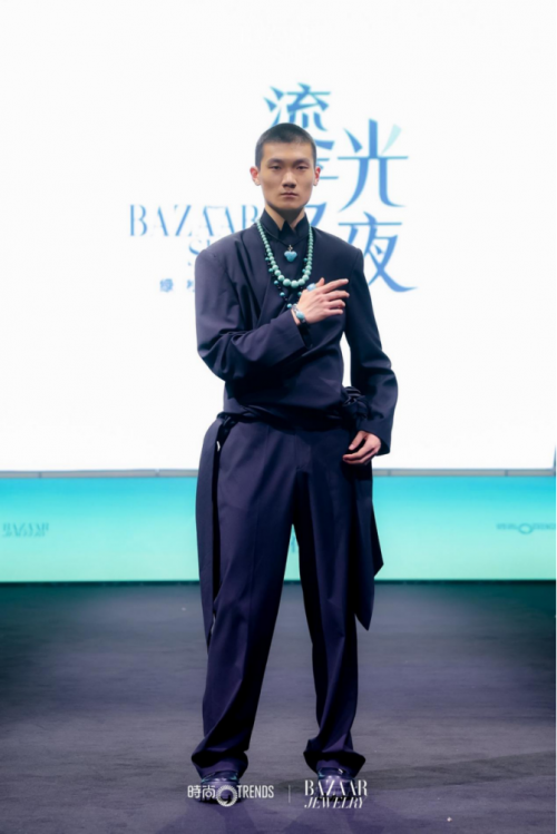 在他的巧思下,绿松石不再是单纯的配饰,而是华服上流淌的青绿血脉——或如山水墨痕点缀于袖间,或如星辰璀璨镶嵌于腰封。他以现代设计语言解构传统符号,让古老的玉石在与当代时装的对话中焕发新生,完美诠释了何为“传统与当代的创新交汇”,为全场观众带来一场直击灵魂的东方美学盛宴。