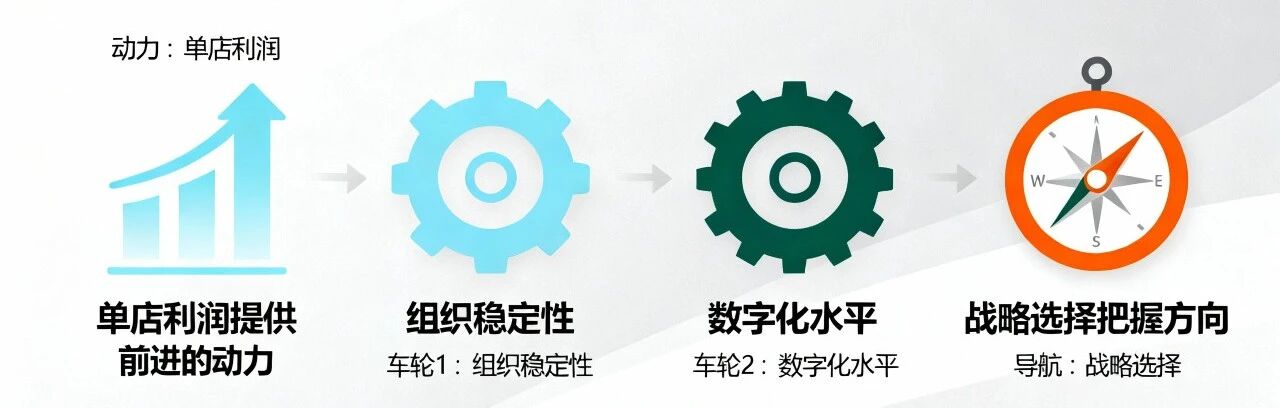 马瑞光博士推出的这套模型理论的精妙之处在于,它将四个要素有机地结合在一起:单店利润提供前进的动力,组织稳定性和数字化水平就像两个稳固的车轮,而战略选择则是把握方向的导航系统。马瑞光博士通过这个模型告诉我们,连锁企业的成功不是某个单一因素的胜利,而是整个系统的协同作战。
