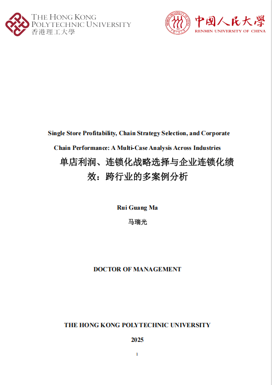 近日,逸马连锁产业集团创始人马瑞光博士正式完成中国人民大学与香港理工大学联合培养的管理学博士学业。这不仅是他个人学术旅程中的重要里程碑,更是中国连锁产业从"经验驱动"迈向"系统驱动"的关键标志。其博士论文《单店利润、连锁化战略选择与企业连锁化绩效:跨行业的多案例分析》提出的"企业连锁化绩效关键成功影响因素模型",为行业提供了兼具理论深度与实践价值的战略指引。
