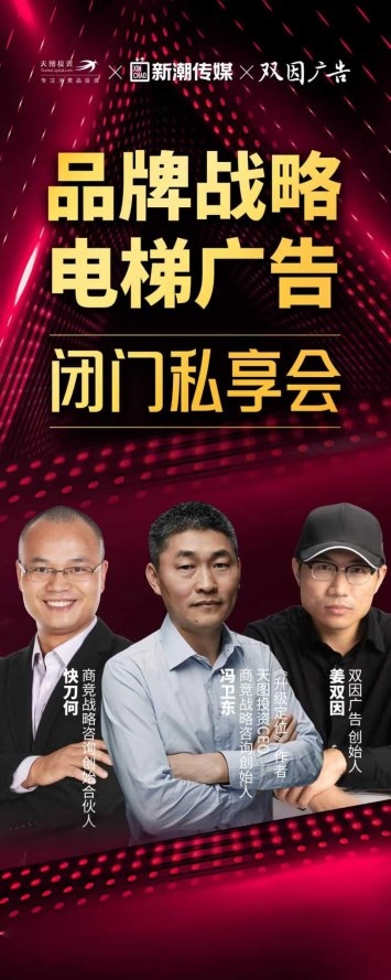 新潮品牌大会第二天,商竞战略咨询集团为参会嘉宾主办了为期一天的“品牌战略与电梯广告”闭门会。会上,商竞战略咨询集团创始人冯卫东,商竞创始合伙人快刀何和商竞合伙人、双因广告创始人姜双因联袂举行三场主题分享。