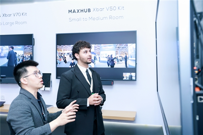 展会现场,视源股份重点展示了其在AI教育、AI会议等领域的全球化成果,体现了“AI赋能全场景”的深度融合。视源股份首席品牌官曾立群、首席海外营销官周莉莉陪同考察并介绍了产品研发及应用情况。