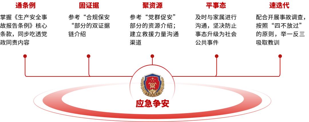 5、应急争安,是在出现意外时,用最快的速度、最小的代价控制住局面,化解危机。应急不是事故发生后的被动反应,必须是一场有准备的行动。要求事前就建立与政府、救援力量的联动机制和沟通渠道。事中不仅要科学救援,更要同步进行证据保护和舆情引导,坚决防止激化社会矛盾,造成负面社会舆论。事后必须举一反三吸取教训,把企业的信用危机转化为重建社会信任的机会。