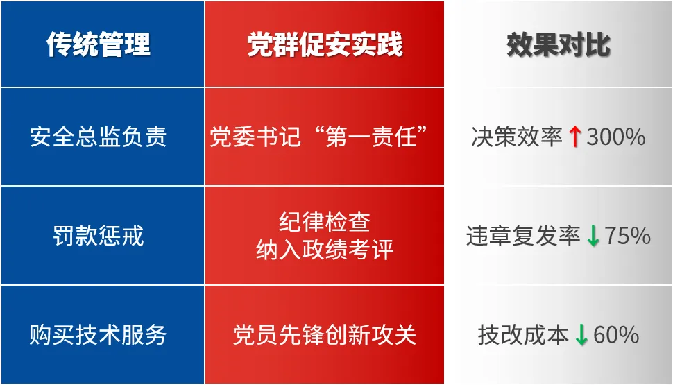 1、党群促安,解决的是顶层设计、资源整合和根本动力问题。确保安全不是某个部门单独负责,而是整个组织体系的核心任务。党群促安不是政治任务,而是通过制度设计将我国的组织优势转化为安全治理效能;是中国式安全管理的政治红利;是中国企业降低传统安全体系成本的最优解。