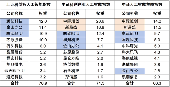 表2:三只人工智能相关指数前十大成份股对比