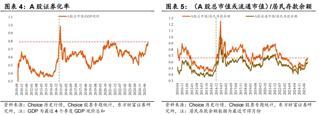 2025年权益市场表现亮眼,沪指10月一度突破4000点,我们认为此次突破与过去两轮显著不同,一是本轮突破用时超过1年,是健康的震荡慢牛;二是推动本轮突破的最重要的力量来自以信息技术为代表的新质生产力;三是本轮市场整体以及各个行业估值水平大多显著低于上一轮。根本原因是当前中国经济质效跃升和A 股市场生态重塑,从股权风险溢价、PE(TTM)、证券化率、A股市值/居民存款余额等指标看,本轮牛市可能仍未走完。