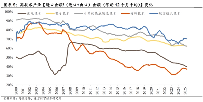 高技术产业的进口依赖度,光电、电子、计算机集成制造、材料及航空航天领域自2008年以来震荡回落、2018年中美贸易摩擦以来加速下行;DeepSeek-R1技术路线实现重大突破,引领中国科技资产重估;创新药研发迎来收获期,据医药魔方,2025年上半年,中国创新药BD交易金额已超过484亿美元,接近2024年全年,中国创新药2015年仅占全球创新药首发4%的份额,到2024年接近38%;中国战机在印巴冲突发挥关键作用,中国装备得到实战检验,打开军贸想象空间。