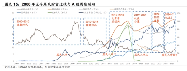 A 股市场生态重塑长牛启航。资本市场生态重塑,新“国九条”核心从融资端改革转向投资端保护,2024年12月政治局会议、2024年中央经济工作会议将“稳住股市”提升至国家政策层面,并强调“增强资本市场制度的包容性、适应性”,同时政策大力推动中长期资金入市,新金融工具准则、“长钱长投”新规破除险资入市障碍,中长期资金有望抬升权益市场运行中枢;低利率环境带来新一轮资产荒,居民股票和基金配置比例仍有明显上升空间,信心重估牛,权益市场或再攀高峰,居民财富配置方向有望系统性转向权益类资产。