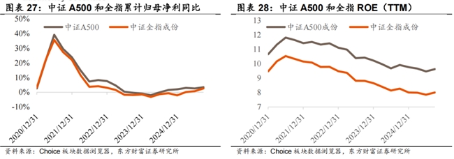 中证 A500 核心财务指标优于中证全指,盈利韧性突出。中证A500指数展现出较强的盈利韧性,整体归母净利润同比增速、净资产收益率(ROE)等核心财务指标较中证全指表现优异。2025年三季度,中证A500指数归属母公司净利润累计同比增速为3.4%,高于中证全指的2.6%;中证A500指数ROE(TTM)达9.6%,超过中证全指的8.0%。