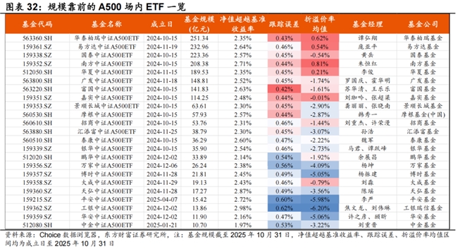 截至2025年10月31日,跟踪中证A500指数的场内ETF中,整体上呈现跟踪误差、折溢价率均值(绝对值)与规模负相关的规律。规模超过100亿元的ETF有8只,超过200亿元的ETF有4只,分别为华泰柏瑞中证A500 ETF(251.34亿元)、易方达中证A500 ETF(232.96亿元)、国泰中证A500 ETF(223.36亿元)、南方中证A500 ETF(208.38亿元),其中,华泰柏瑞中证A500 ETF、南方中证A500 ETF跟踪误差更小,也位于所有场内A500 ETF前列,值得注意的是,南方A500 ETF区间净值超越基准收益率具备明显优势,折溢价率均值(绝对值)也并不高,具备“低偏离 + 精准跟踪 + 规模支撑”优势。