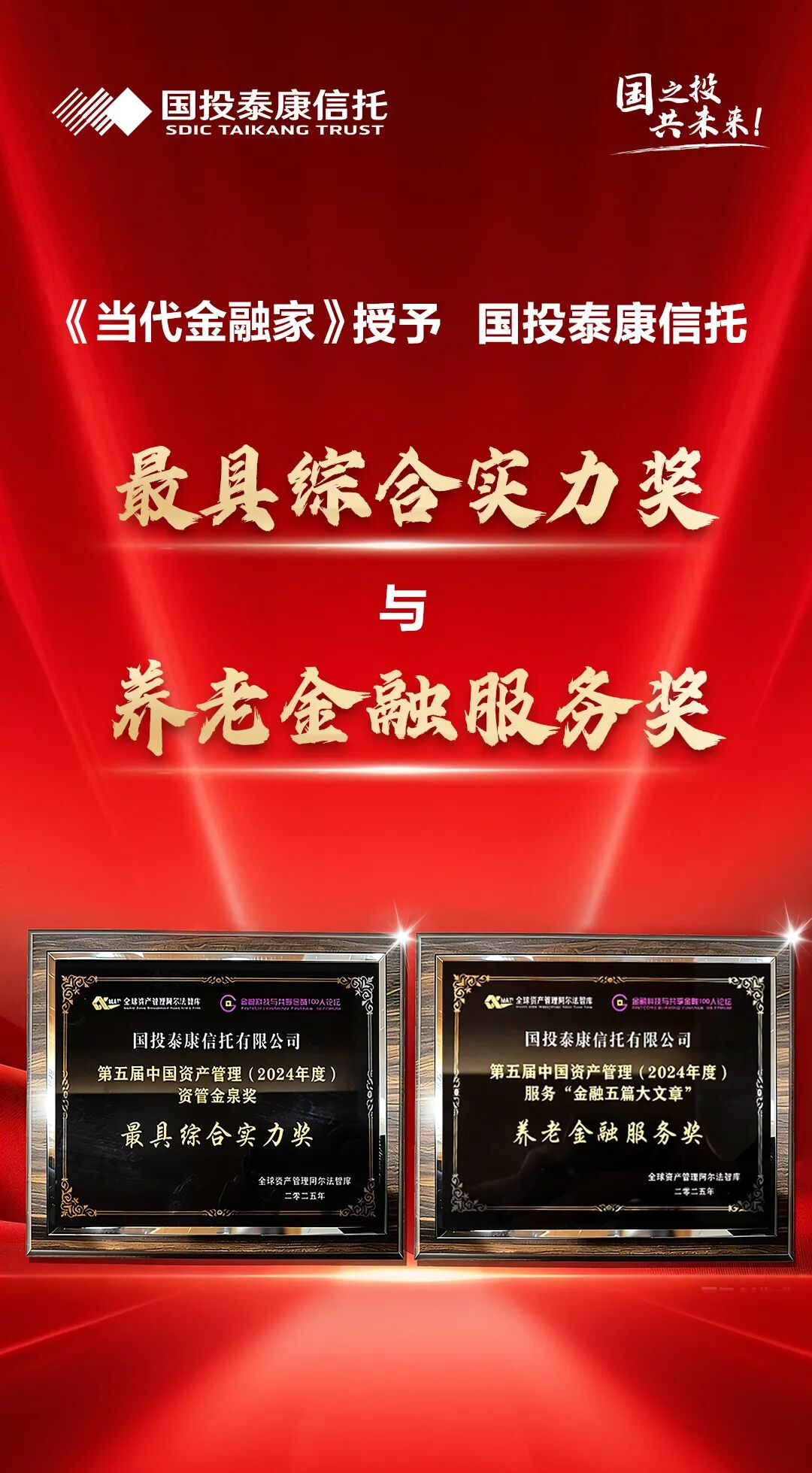 12月15日,由全球资产管理阿尔法智库主办,《当代金融家》杂志指导的“第五届中国资产管理(2024年度)领军榜资管金泉奖”评选结果正式揭晓。国投泰康信托凭借在养老金融领域的突破性实践与全面稳健的综合经营能力,一举斩获“最具综合实力奖”与“养老金融服务奖”双项重磅荣誉,彰显行业对公司专业价值与发展质量的双重肯定。