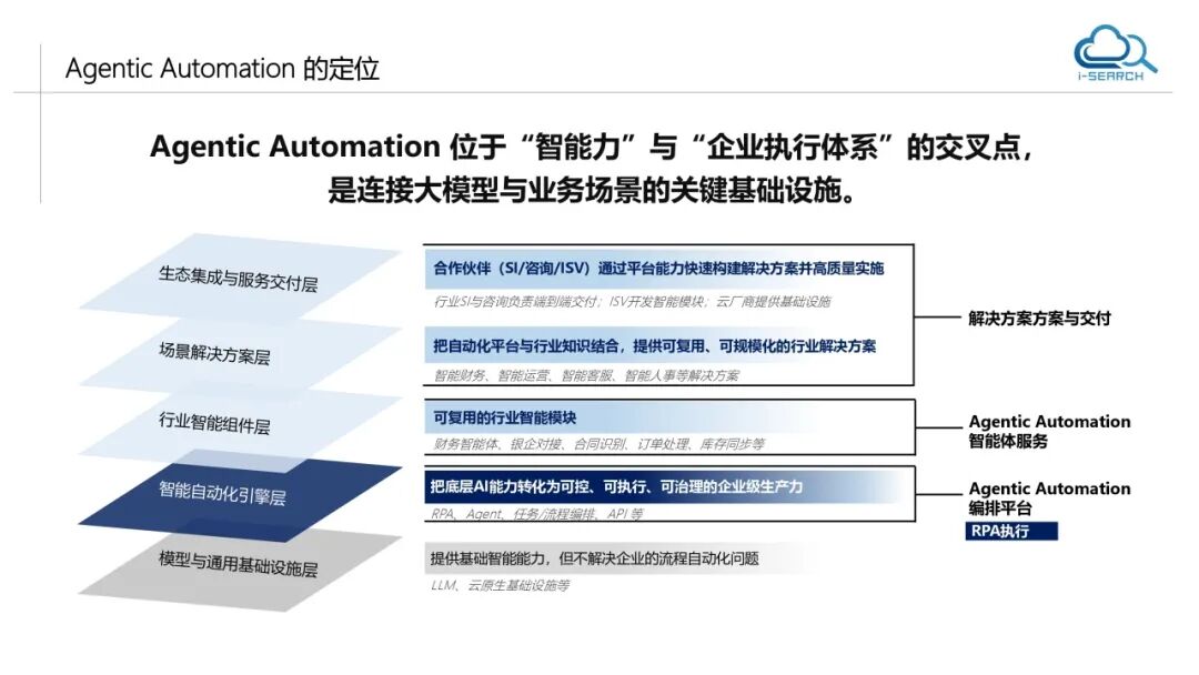 李博将 Agentic Automation 定义为 “智能力与企业执行体系的交叉点”。它并非替代现有RPA与AI技术,而是将其整合为分层、可扩展的技术架构: