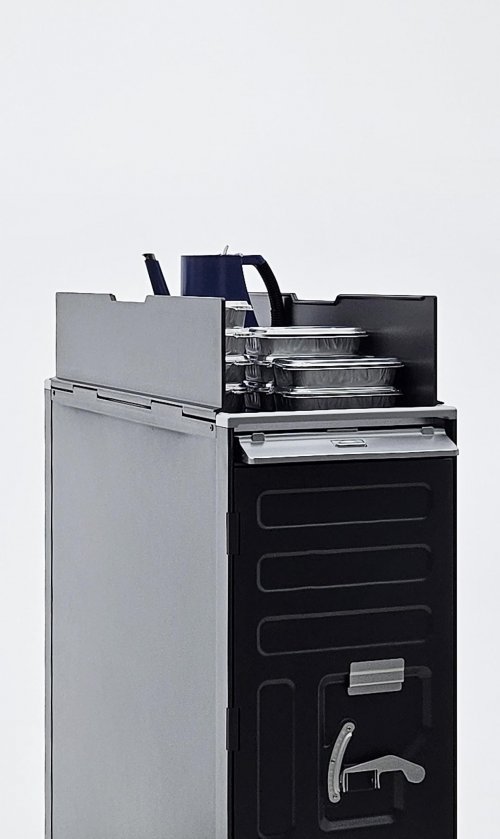 这套厨房系统分为上中下三个操作区域,设置了迎宾、工作、休息三种光效,为乘务员与乘客带来愉悦体验。基于餐车基础模块拓展成为垃圾车、冰箱、烤箱等不同功能组合,重塑作业流程。