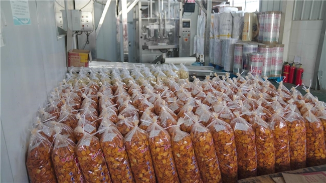 “现在我们每天的产量都有7、8吨,线上线下能各占一半吧”,谈起自己的产品,饱经风霜的刘亚妮娓娓道来,“我们的锅巴主要的原材料是豌豆、大米、小米,我们尽量用咱本地的材料,包括我们那个辣椒,你看它很红,是用新疆的甜椒跟陕西的秦椒一块搭配的,看着很红,但是它不辣,适合各种人群。”