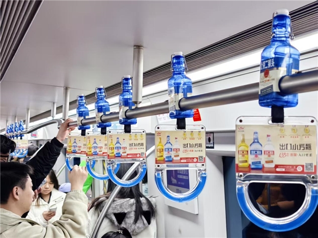 长期以来,传统白酒品牌陷入“场景固化”与“表达脱节”的双重困境:营销场景集中于商务宴请、礼品消费等传统领域,传播语言仍停留在“百年传承”“古法酿造”的厚重叙事,与年轻消费群体的生活场景、沟通习惯严重错位。而出口小方瓶的地铁营销,精准切中这一痛点——选择地铁这一年轻人日均高频接触的通勤场景,将广告载体与扶手功能深度融合,让品牌自然融入目标群体的日常生活;同时摒弃密集文案与复杂设计,以3D立体造型、轻量化标语传递“135℃蒸馏”“纯粮酿造”核心价值,用“触觉+视觉”的双重体验替代单向信息灌输,极大降低了年轻群体的接受门槛。