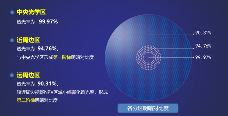 匹配视网膜近周边视杆细胞急剧增加的生理特点,除 5 环梯度离焦带外,还通过 94.76% 的透光率与中央区形成第一阶梯明暗对比。这一设计既通过离焦信号控轴,又贴合近周边区域对“较弱光照”的需求,减少强光刺激引发的视疲劳。