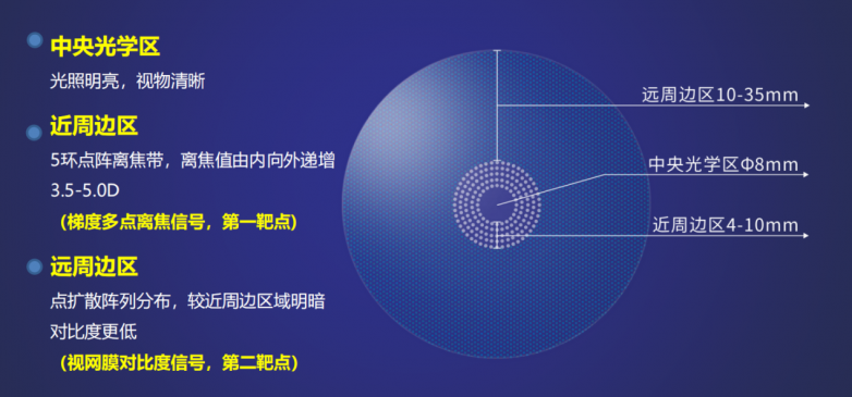 童瞳佳双靶点光控近视管理镜片并非单一功能设计,而是根据人眼不同视场角的感光细胞分布与生理功能,将镜片划分为中央光学区、近周边区、远周边区三大区域,实现“防控+清晰+舒适”的三重平衡。