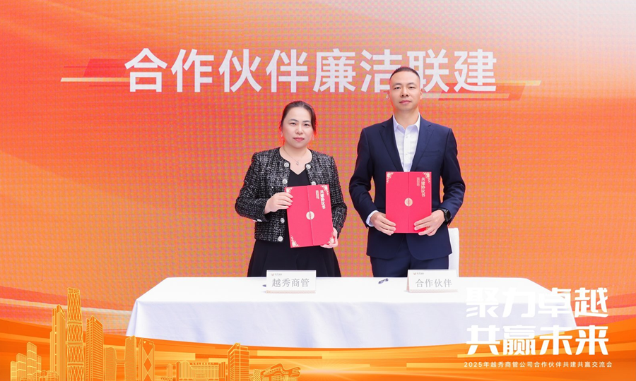 为进一步筑牢廉洁防线、规范合作行为,大会特设廉洁协议联合签署环节。越秀商管党委副书记、越秀房产基金执行董事及行政总裁区海晶代表公司,与合作伙伴代表现场签署了廉洁合作协议,将“阳光合作、诚信经营”的共同追求固化为庄严承诺,为长远合作筑牢“防火墙”。