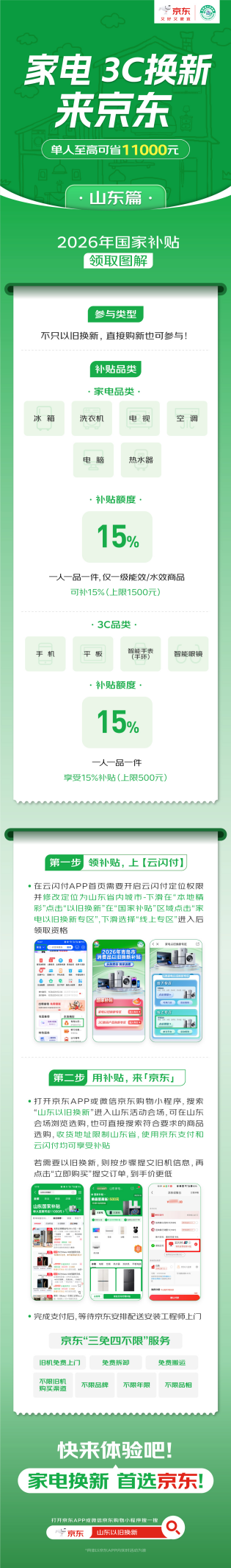 1月4日,2026年国家以旧换新补贴落地山东,京东线上线下全面承接国家补贴落地。山东消费者到京东APP搜索“山东以旧换新”即可进入国补页面,享国补购心仪好物。上京东,消费者购买活动指定的冰箱、洗衣机、电视、空调、电脑、热水器产品,单件/单次至高补贴1500元;购买活动指定的手机、平板、智能手表手环、智能眼镜产品,单件/单次至高补贴500元。单人累计至高可省11000元!此外,京东也带来海量爆款好物,1月1日起,上京东领国补,买手机、电脑、家电等好物低至五折!