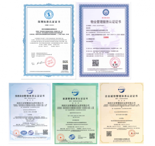 此次获证,是天安运营管理底蕴的又一次升华。此前,公司已先后成功通过了多项重量级权威认证,包括ISO 9001(质量)、ISO 14001(环境)、ISO 45001(职业健康安全)、GB/T 20647.9-2006(物业管理服务)、SGS认证(深圳标准认证)、ISO 27001(信息安全管理体系认证)、ISO 50001(能源管理体系认证)、GB/T 31950(诚信管理体系认证)。